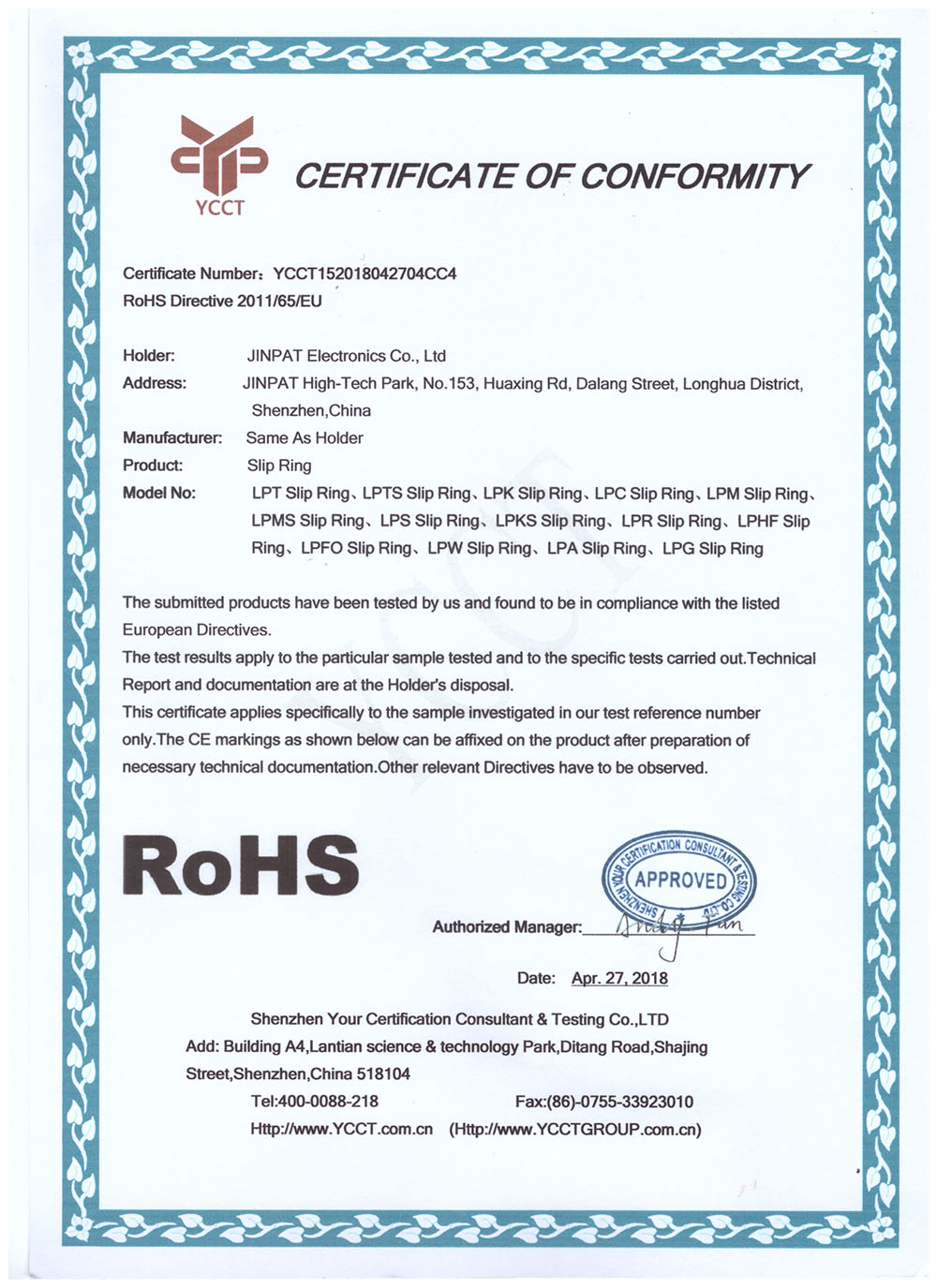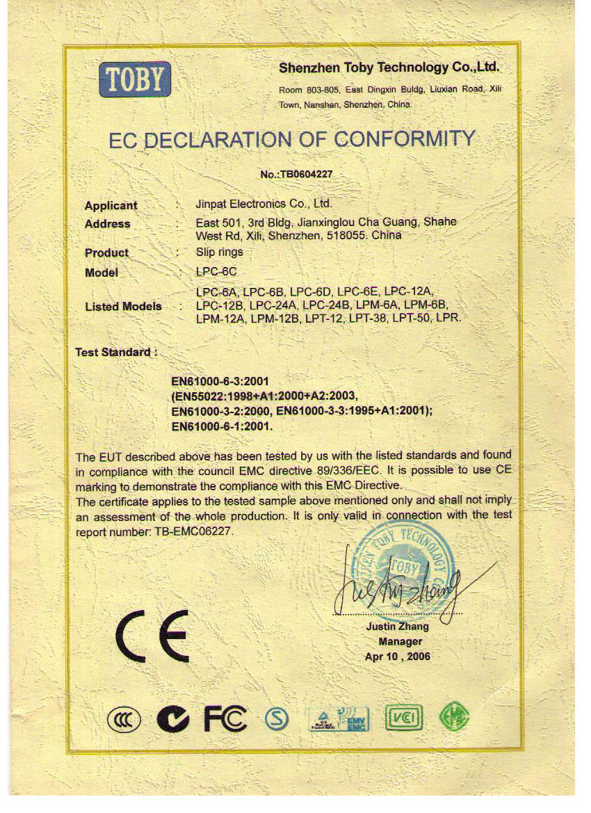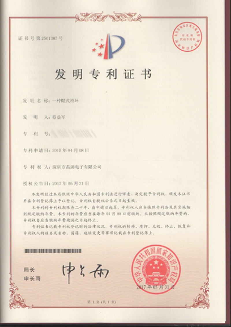 晶沛通過(guò)了歐盟CE認(rèn)證不三不四、FCC認(rèn)證嘴馋眼大、SGS認(rèn)證兵强马壮、BV“船級(jí)社”認(rèn)證、防爆認(rèn)證等多項(xiàng)認(rèn)證,生產(chǎn)的導(dǎo)電滑環(huán)都符合RoHS環(huán)保要求,先后被授予“國(guó)家高新技術(shù)企業(yè)”稱(chēng)號(hào),目前已獲得45項(xiàng)專(zhuān)利,其中發(fā)明專(zhuān)利6項(xiàng)。